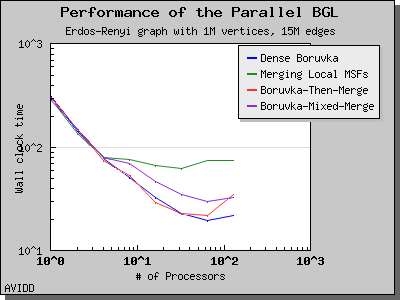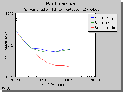 The following charts illustrate the performance of this algorithm on various random graphs. We see that the algorithm scales well up to 64 or 128 processors, depending on the type of graph, for dense graphs. However, for sparse graphs performance tapers off as the number of processors surpases m/n, i.e., the average degree (which is 30 for this graph). This behavior is expected from the algorithm.